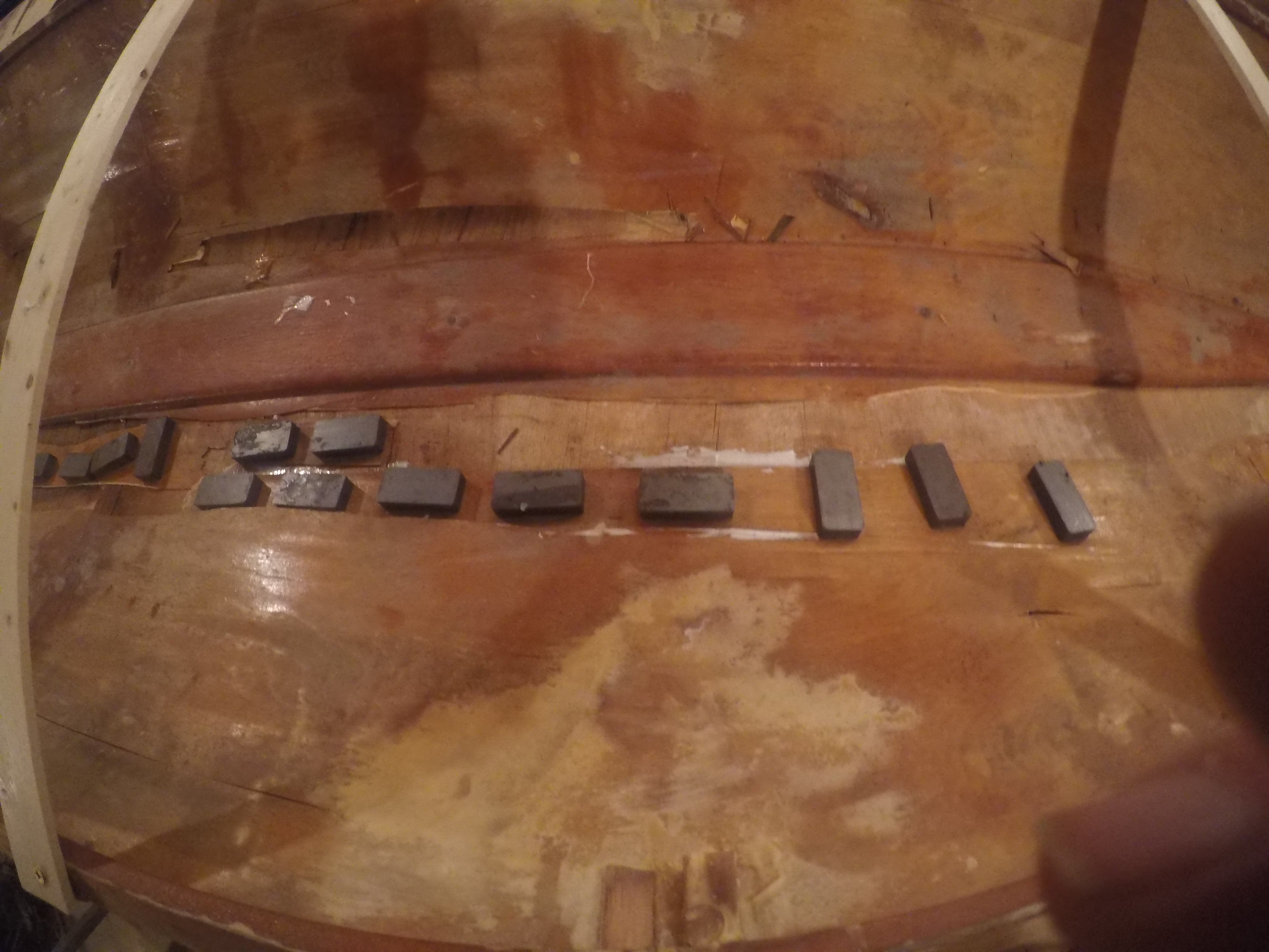 These little gems have about an 8lb pull which is ok for what I needed and was willing to spend. I started by regluing a 6″ piece and placing a pair on the inside and outside of the hull. I was able to reposition each pair although sometimes they like to connect to each other and double up (which increased the pull strength).