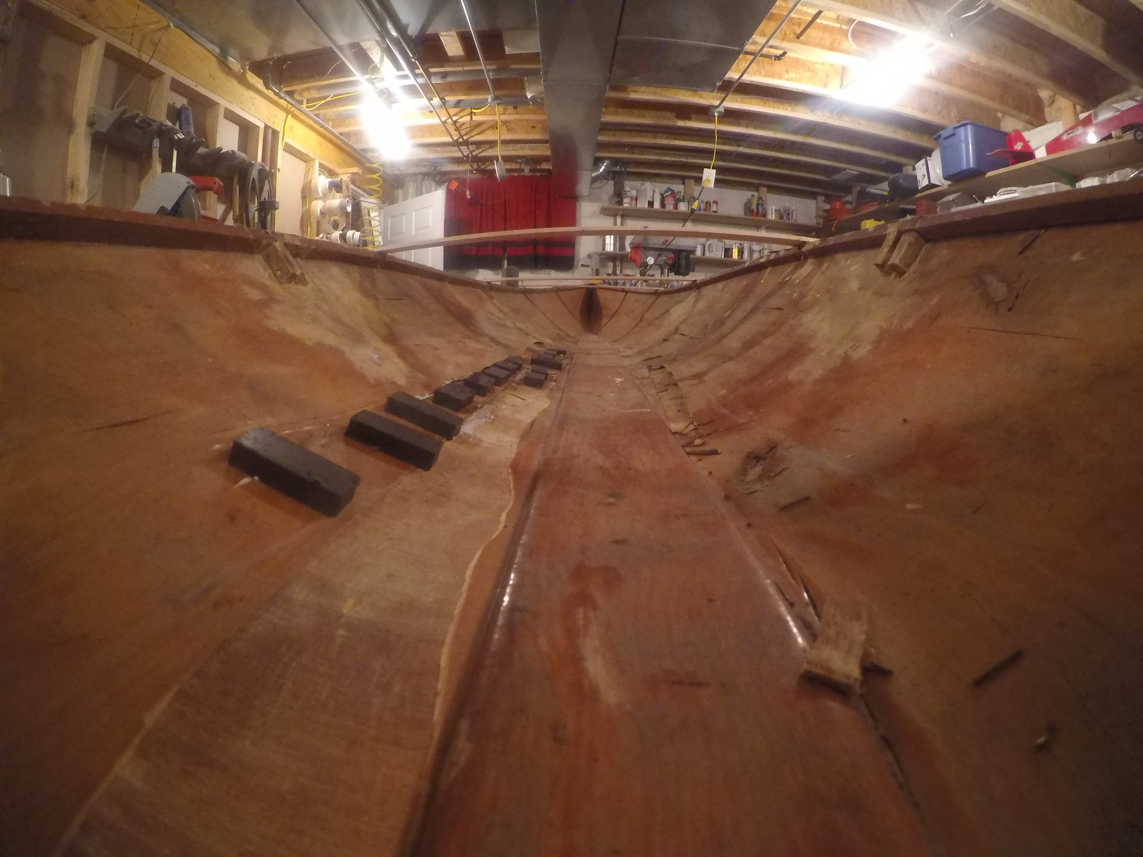 Since removing the deck, I’ve been focusing on the hull. The problem I had was regluing much of the plywood veneer back in place. Using waterproof glue I did not have a problem clamping the loose wood near the shear clamp. However much of the problem was further down the hull where the clamps could simply not reach