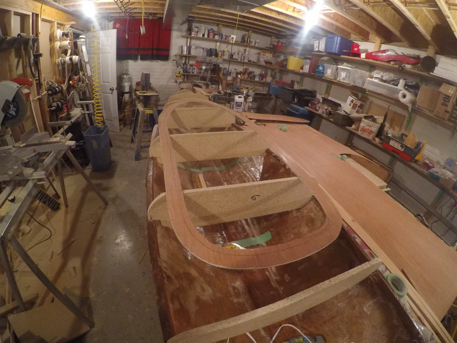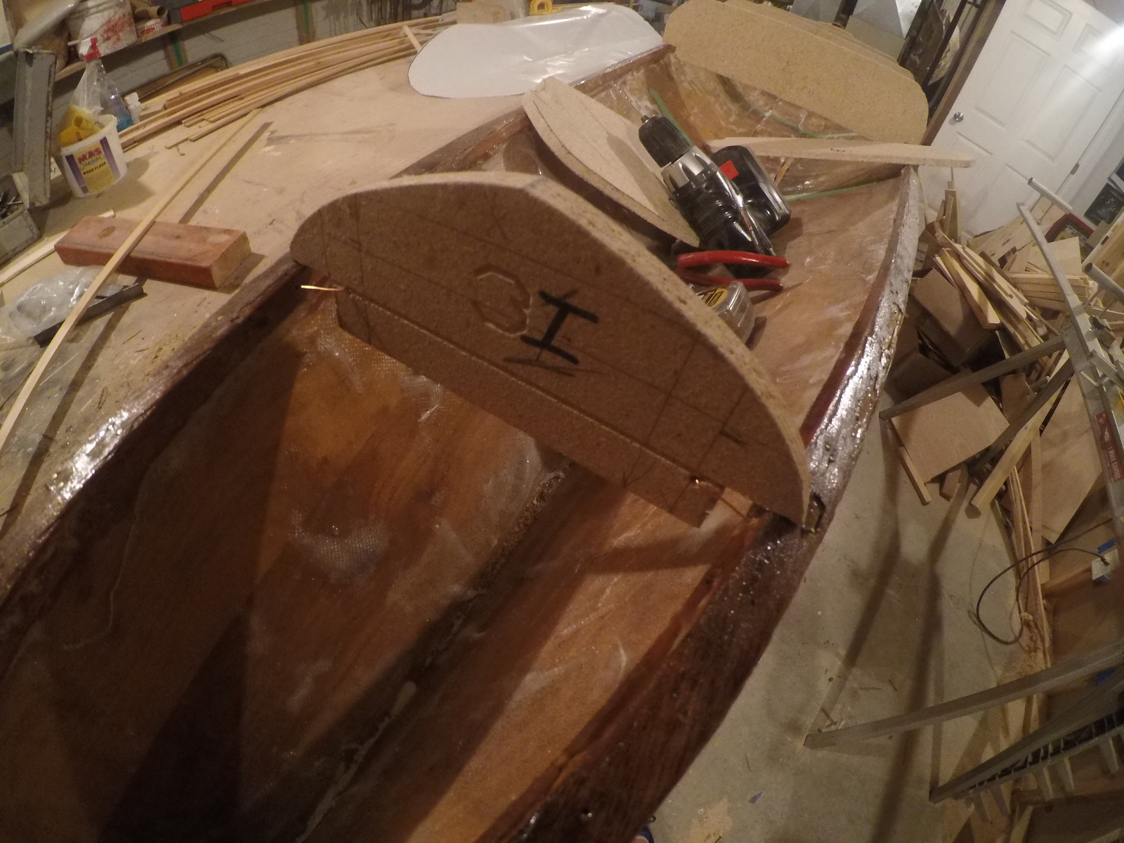 The first form (notice the 1 in black) in place. In a previous post I showed the forms. But all were just setting in place. Now they need to be fastened solidly to the hull-not permanently but strong enough to hold during abuse yet be able to release from the hull when it’s time take the deck off to work on the underside.