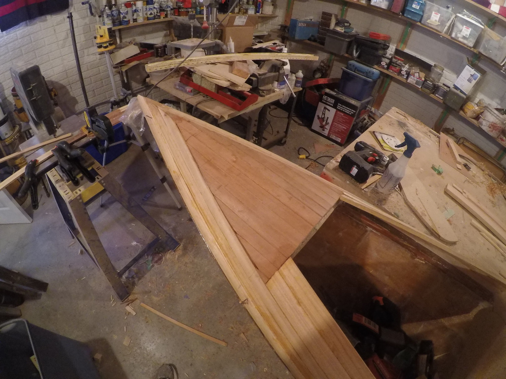 The post picture shows the bow. I used some of the left over t/g western red cedar I had in my basement. The wood came from my Heron kit and it is top-grade wood. It’s also not cheap but I thought it would be a nice touch at the bow. We’ll see.